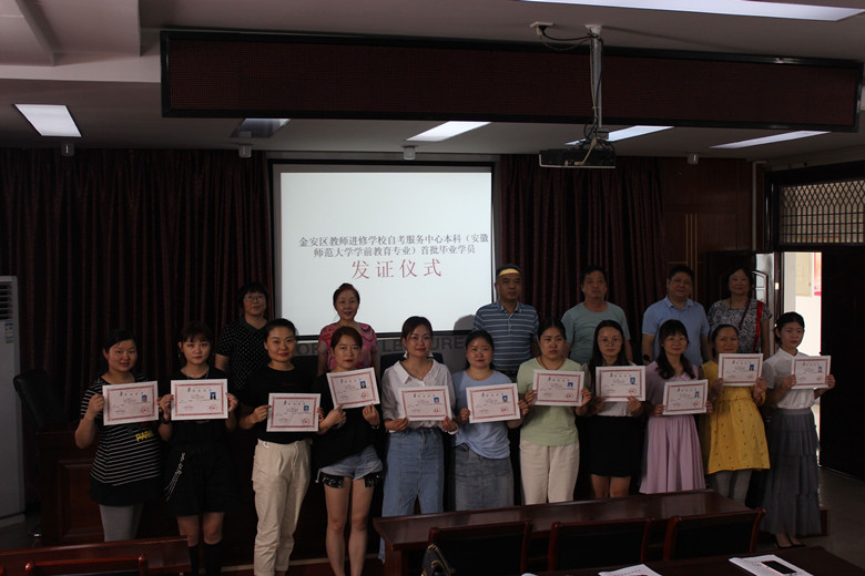 2019年08月29日,安徽师范大学金安区教师进修学校自学考试学习服务中心学前教育本科专业首批学员统一到金安区教师进修学校领取大学本科毕业证。